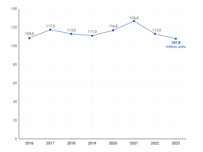 Bir diğer konu ise adetsel olarak ev aletleri ürünlerinin satışları; 2020 ve 2021 yıllarında pandemi ile eve kapanan insanların ev aletleri ile çok daha fazla zaman geçirmesi ve değişen tüketici davranışlarıyla birlikte 2021 yılında adetsel olarak satışlarda rekor kırılması akabinde hem küresel ekonomideki gelişmeler, hem de sosyopolitik gelişmelerin sebebiyle satış adetlerinin 2022 ve 2023 yıllarında düştüğünü gözlemliyoruz.