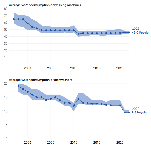 Raporda çamaşır ve bulaşık makinelerinin 1990’ların sonundan günümüze bir yıkama çevriminde tükettikleri su ve elektrik verilerini de bulabiliyoruz.
