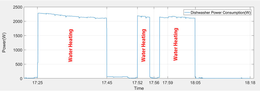 Peki durum bulaşık makinesi için nasılmış ona da bakalım; Aşağıdaki grafik bir bulaşık makinesinin 65 derece yıkama programı için elektrik tüketim grafiğidir. Bu grafikte Water Heating, su ısıtmadaki elektrik tüketimini göstermektedir.