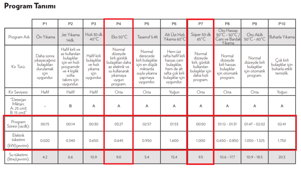 Yukarıda 10 programlı bir bulaşık makinesinin program isimlerini, program sürelerini ve elektrik tüketimlerini görmektesiniz. Çevremdeki çoğu kişi, yıkama süresinin kısa olduğu programların daha ekonomik olduğu görüşüne sahip olmasına rağmen aslında gerçekler düşünüldüğü gibi değil. Süper 50 dk programında su sıcaklığı 65 C derece ve programın süresi 50 dk olmasına rağmen bir yıkama işlemi için tükettiği elektrik miktarı 1kWh. Bir de “eko” programını inceleyelim; Program 3 saat 27 dakika sürüyor ve 3 saat 27 dakika süresi sonunda tükettiği elektrik miktarı 0,645kWh.