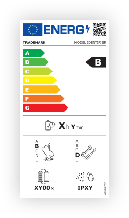 Enerji etiketinde, A-G aralığında enerji verimliliği sınıf, A-E aralığında kazara düşmelere karşı dayanıklılık sınıfı, A-E aralığında tamir edilebilirlik sınıfı, Bataryanın yönetmelikte belirtilen şartlarda kullanım süresi ve IPXY olarak adlandırılan toza ve suya karşı dayanımı göstermektedir. IPXY tanımı aslında uzun yıllardır hayatımızda olan bir sınıflandırma ancak bu konuya yazımın sonunda yer vermek istiyorum.